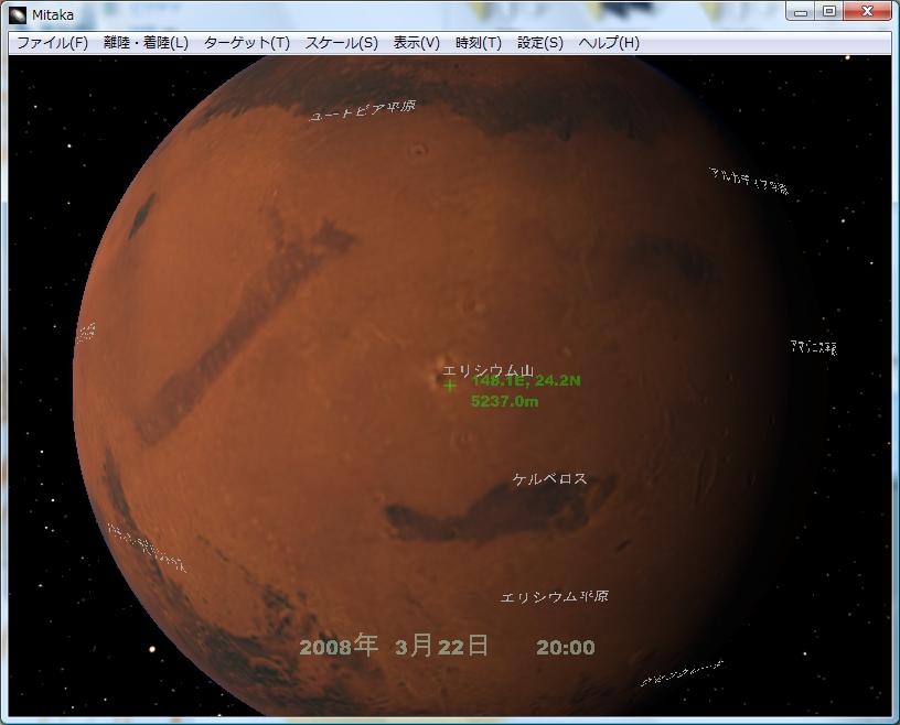 地球と火星は地表データを別にダウンロードすると、ポイントした地表の標高が出ます。(火星の画像の緑字)